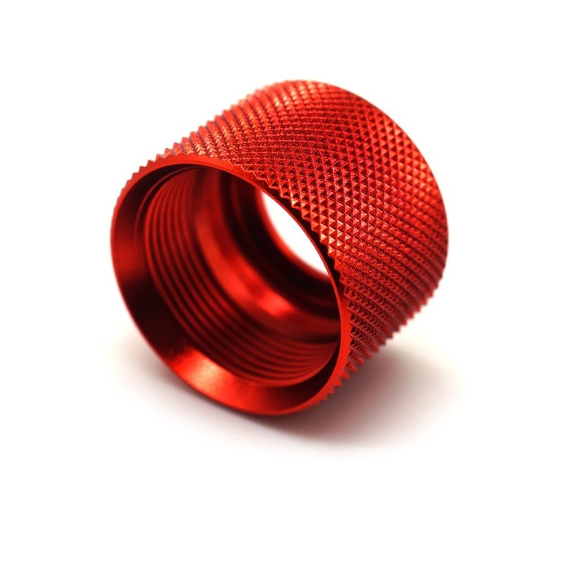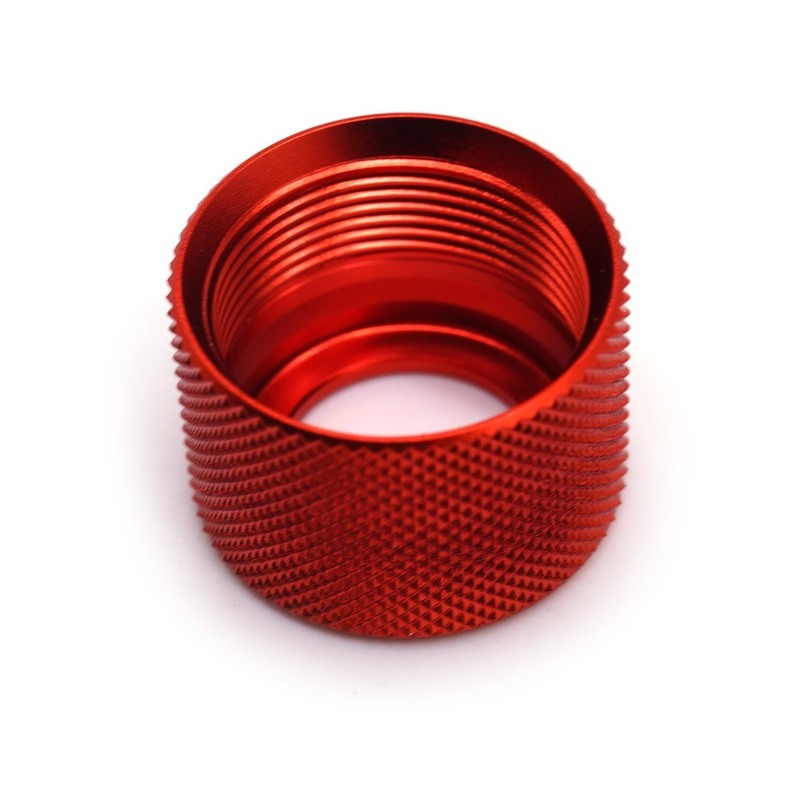 Dit product is een precisie CNC-gefreesde aluminium gekartelde ring, met een cilindrische vorm met interne schroefdraad en een fijn gekarteld grip oppervlak. Het onderdeel is afgewerkt met een levendige rode geanodiseerde coating, die zowel de esthetiek als de corrosiebestendigheid verbetert.